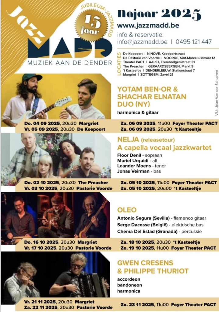 26 juli 2025Jazz Madd 15 jaar Muziek aan de Dender NELJA - A capella vocaal jazzkwartet donderdag 02 oktober 20:30 The Preacher…