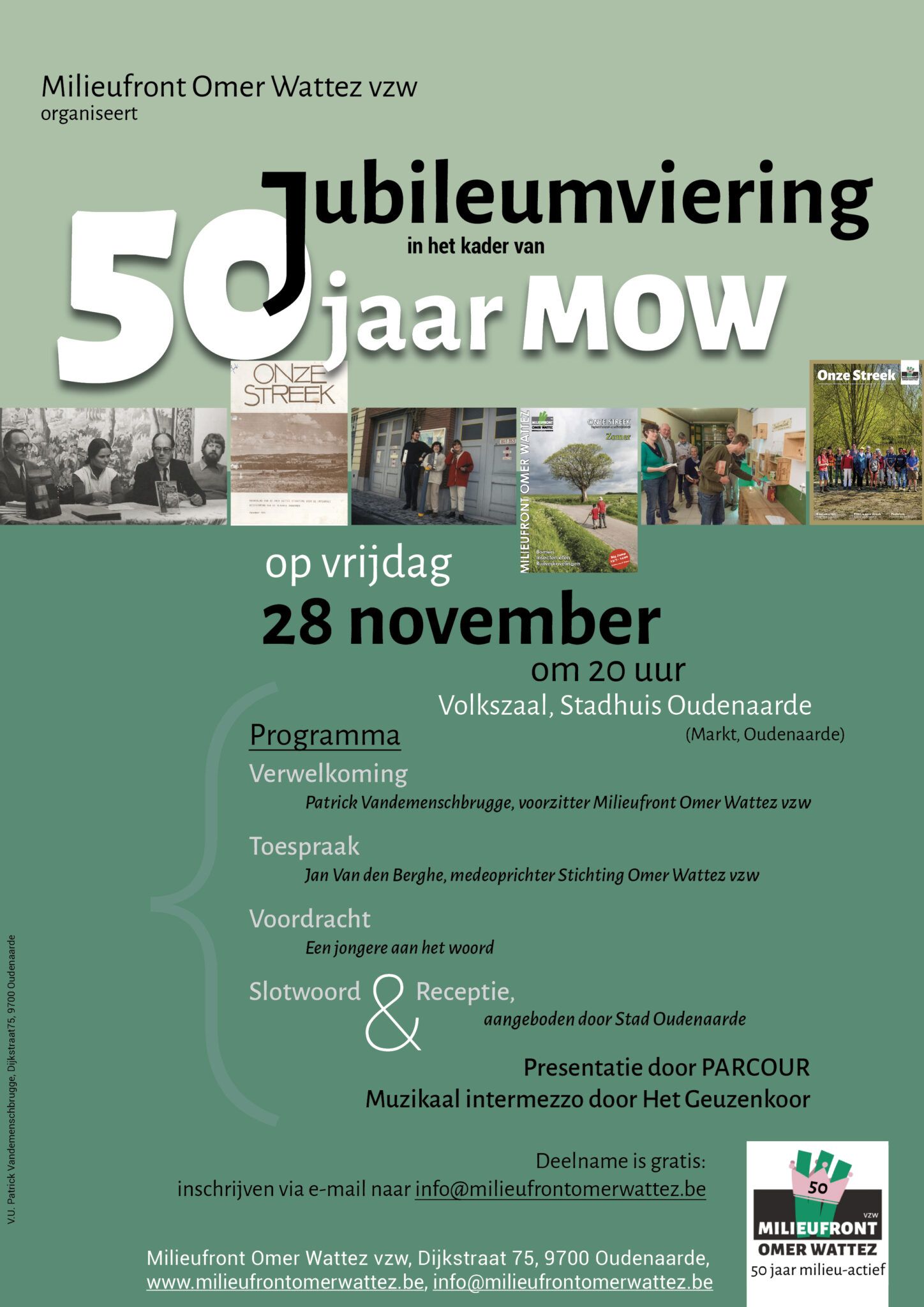 Milieufront Omer Wattez vzw organiseert op vrijdag 28 november een Jubileumviering in het kader van ’50 jaar MOW’. Jullie zijn welkom om 20 uur (deuren open: 19.45) in de volkszaal van het Stadhuis Oudenaarde.