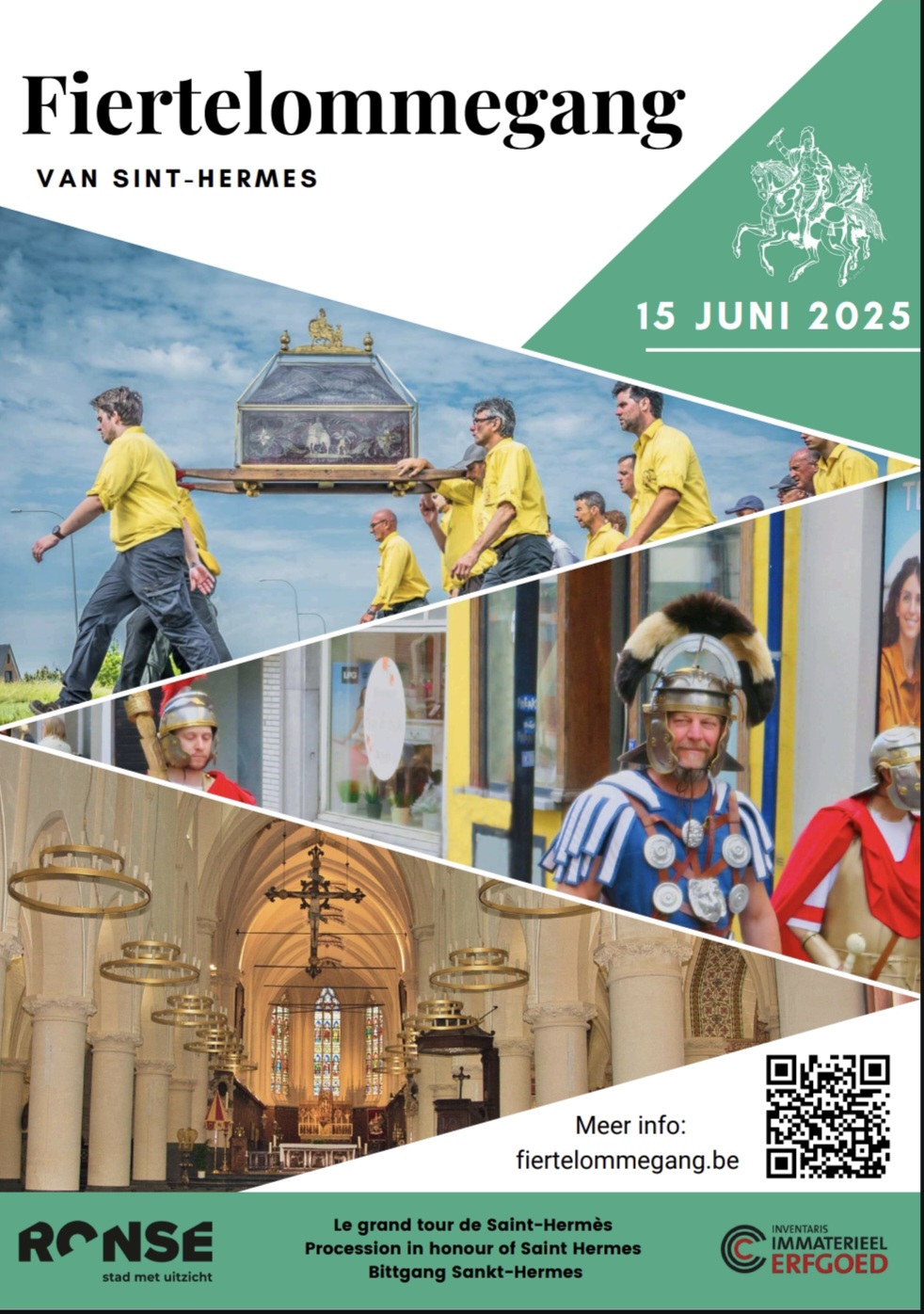 17:45 Vertrek van de historische processie, gevolgd door de Gilden, het terugkerende reliekschrijn van Sint- Hermes, Kerkelijke en Burgerlijke overheid, genodigden en de massa aan bedevaarders en ruiters.
