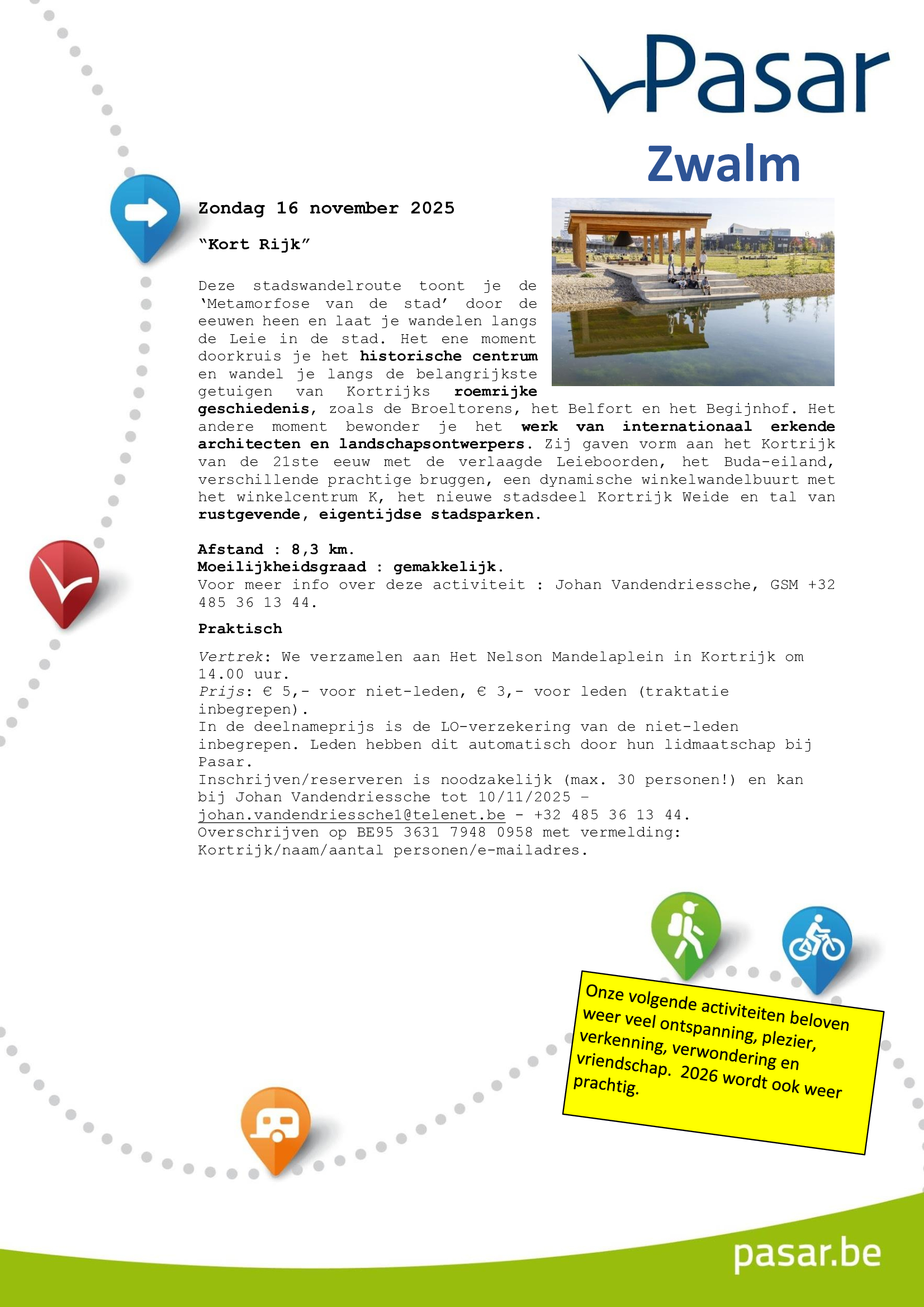 Vertrek: We verzamelen aan Het Nelson Mandelaplein in Kortrijk om 14.00 uur.