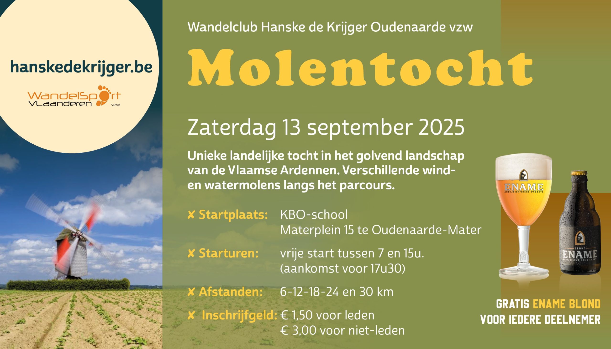 Met deze nieuwsbrief willen we u uitnodigen om deel te nemen aan onze MOLENTOCHT van komende zaterdag. Deze unieke landelijke tocht start vanuit Mater en kronkelt doorheen Horebeke en Boekel langs diverse wind- en watermolens. Als je écht wil genieten van de Vlaamse Ardennen dan mag je deze kans niet laten liggen. Wij zoeken de mooiste wandelpaadjes voor jullie uit ! Allen op post.