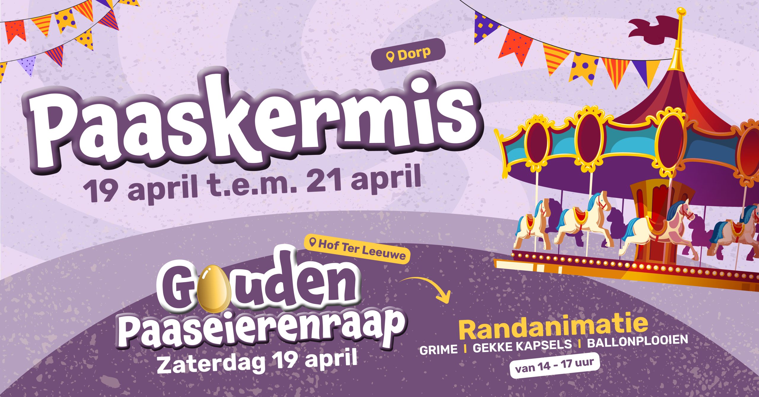 Tijdens het paasweekend van 19 tot 21 april kan je op het Dorp in Denderleeuw terecht voor de jaarlijkse Paaskermis. Naast verschillende kermiskramen, worden de bezoekers eveneens getrakteerd op randanimatie. Op zaterdag 19 april kunnen kinderen van 0 tot en met tien jaar gratis meedoen aan de Gouden Paaseierenraap!