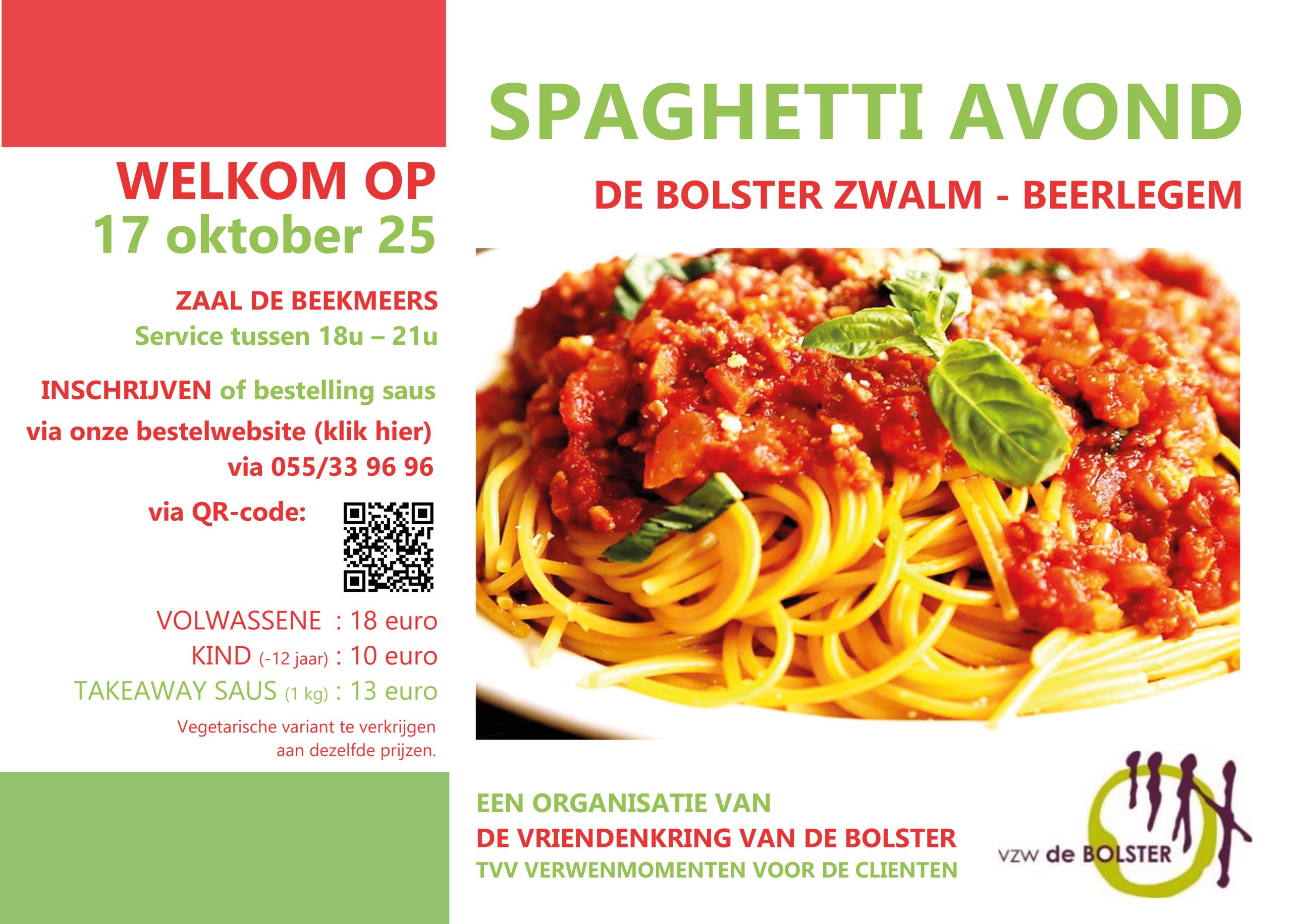 store.onzeverkoop.be/vzw-de-bolster/spaghetti-avond, telefonisch via 055/33 96 96 of met de QR-code die terug te vinden is op de flyer