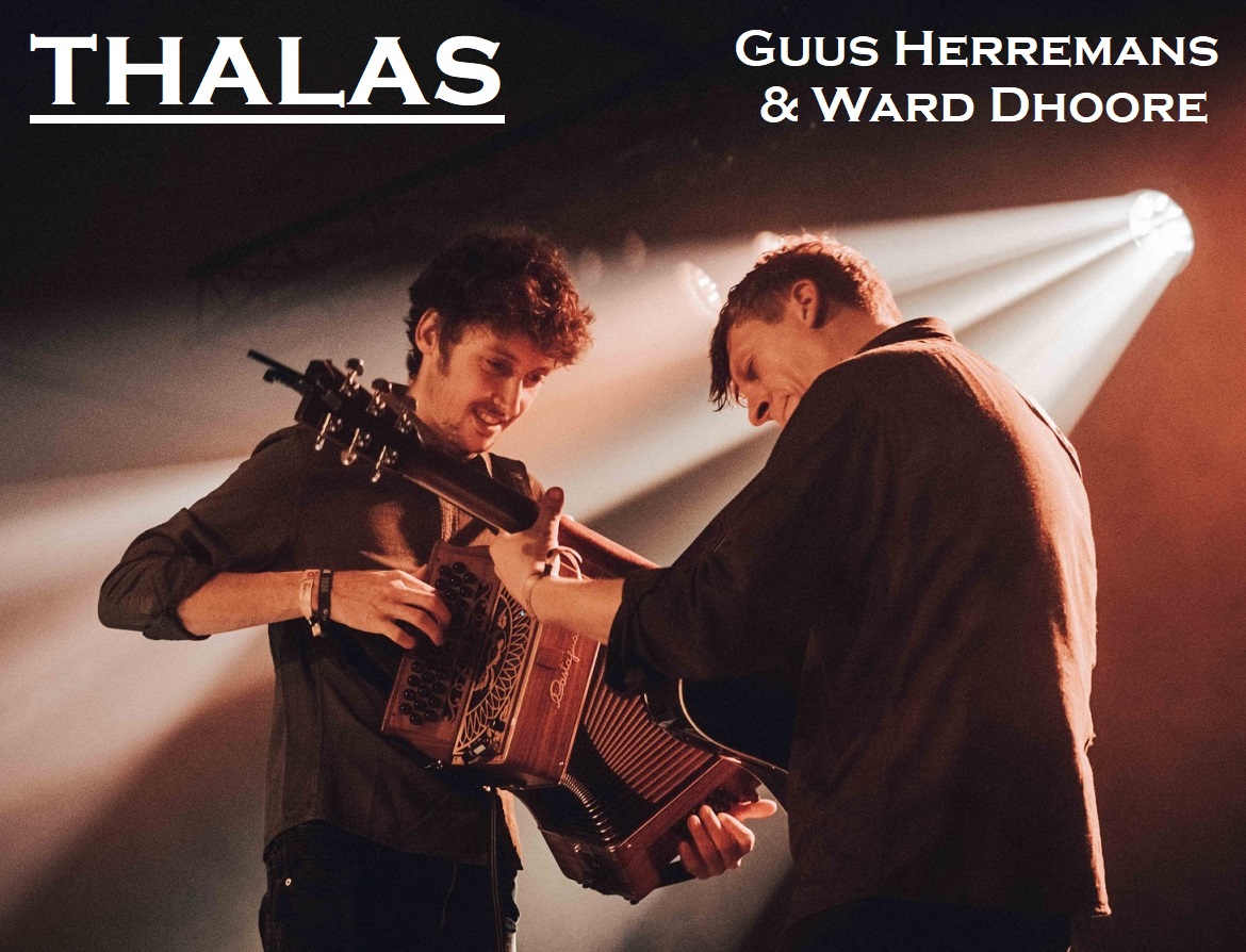 Guus Herremans en Ward Dhoore kent u misschien van bands als Aelia, Airboxes, Estbel, Les Bottines Artistiques, Nufolk Global Connections, Phlox, Siger, Snaarmaarwaar, Spilar en Trio Dhoore. Beiden werden door radio Klara geselecteerd voor De Twintigers , een programma dat talentvolle twintigers in het zonnetje zet. Nu vieren ze hun jarenlange vriendschap op het podium van het Bruggenhuis als Thalas. Zorg dat u erbij kan zijn!