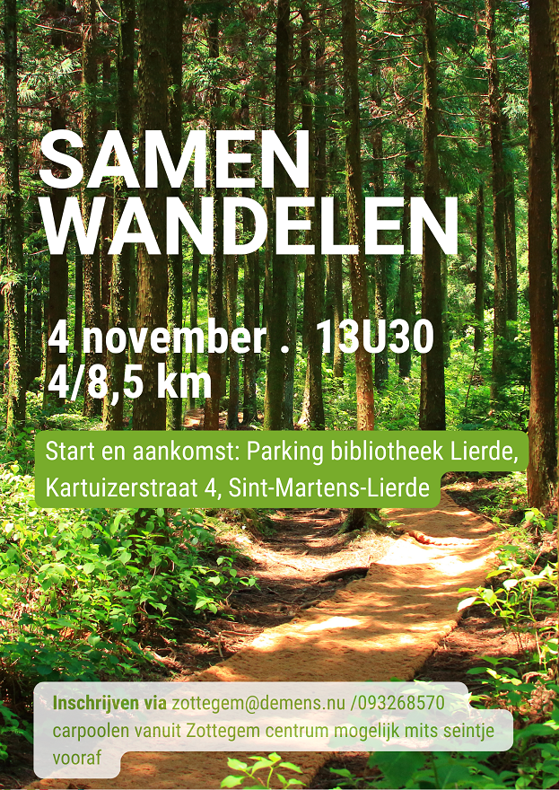 4 oktober 2025Dinsdag 4 november 2025Â -Â 13u30 Parking bibliotheek Lierde, Kartuizerstraat 4, Sint-Martens-Lierde gratis Graag inschrijven voor 28 oktober via zottegem@deMens.nu…