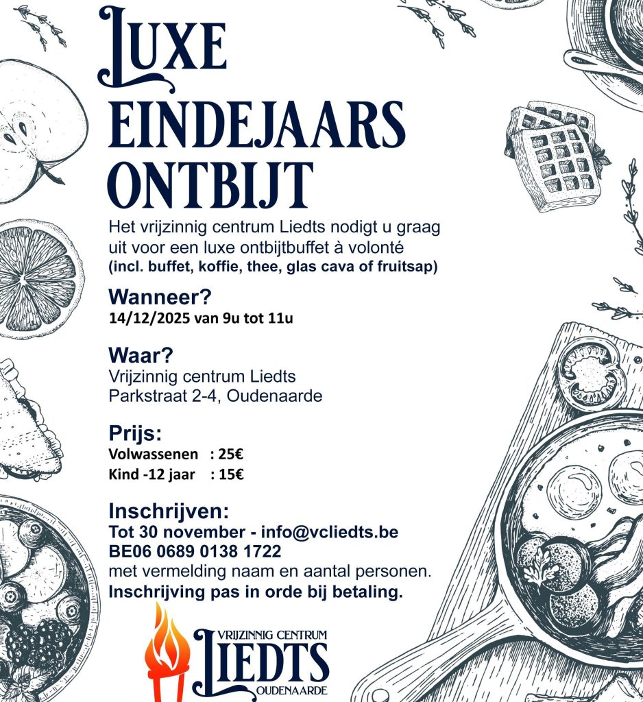 29 september 2025Vrijzinnig Centrum Liedts nodigt uit: Luxe eindejaars ontbijt zo 14 december van 9u tot 11u Vrijzinnig Centrum Liedts Parkstraat 2-4Oudenaarde Jaarlijks…