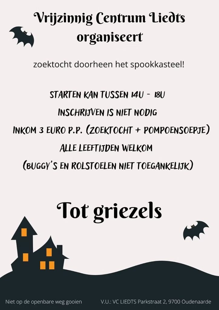 29 september 2025Vrijzinnig Centrum Liedts stelt voor: Spookkasteel. zaterdag 25 okt 2025, 14:00 – 18:00 Oudenaarde, Parkstraat 2, 9700 Oudenaarde Kom op…