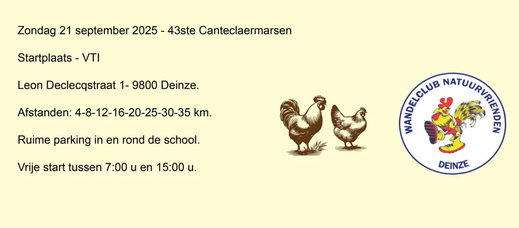 28 mei 2025De Gordel der Leiestreek Zondag 21 september 2025 VTI Leon Declercqstraat 1 9800 Deinze start 07.00-15.00 Inschrijving dient ter plaatse…