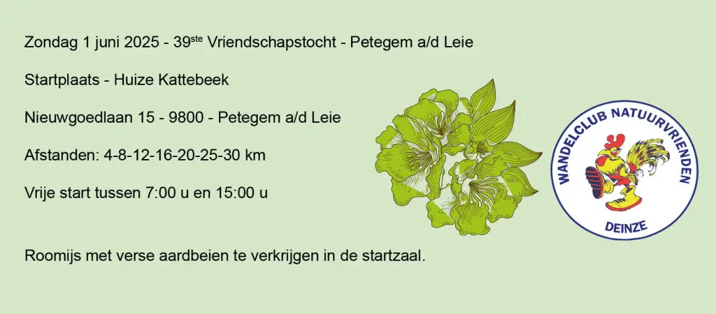 28 mei 202539ste Vriendschapstocht Petegem a/d Leie zondag 1 juni Startplaats Huize Kattebeek Nieuwgoedlaan 15 Petegem a/d Leie vrijestart tussen 07 en…