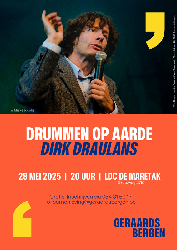 27 april 2025Lezing Dirk Draulans woensdag 28 mei 20:00 LDC De Maretak Groteweg 27, 9500 Geraardsbergen Gratis - inschrijven samenleving@geraardsbergen.be of 054316017 We…