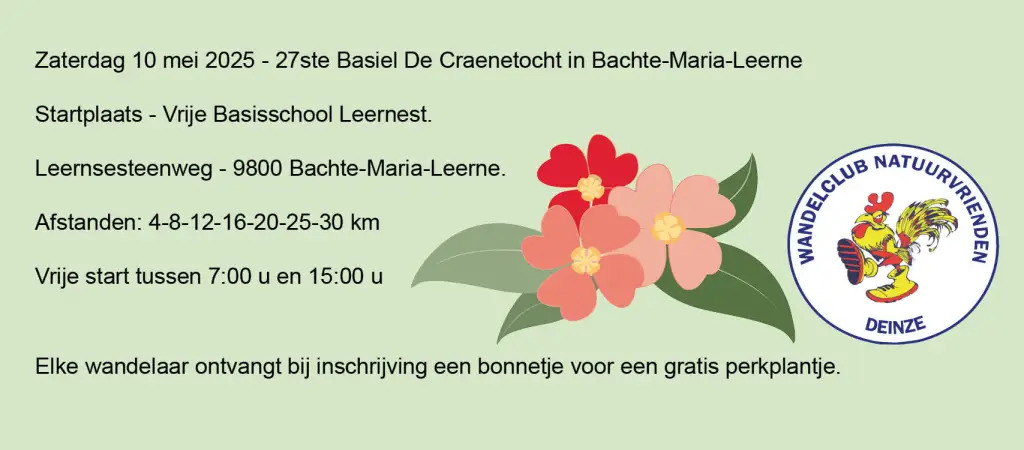 25 april 2025Op 20 - 21 en 22 mei 2025 De wandelingen starten zoals steeds in het Brielpaviljoen te Deinze Lucien Matthyslaan,…