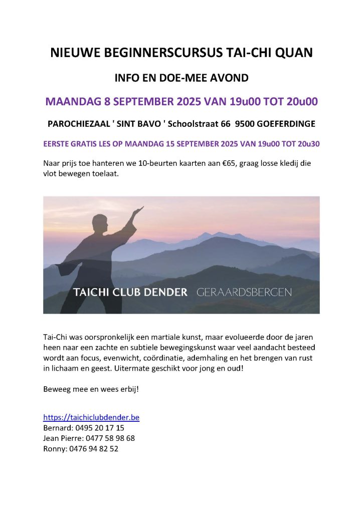 17 juli 2025Nieuwe beginnerscursus Tai-Chi Quan. Op maandag 08 september 2025 richten we van 19u00 tot 20u00 een info- en doe-mee avond…