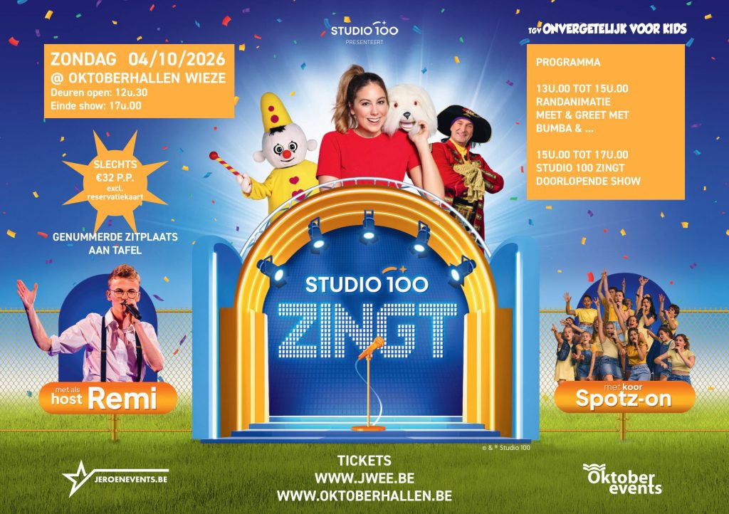 6 december 2025Zondag 4 oktober 2026 Denderstreek Showtime: 13u – 17u (2 uur Studio 100 Zingt Liveshow – 2 uur meet &…