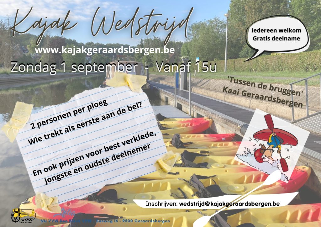 10 augustus 2024Doe op zondag 1 september mee met de kajakwedstrijd van VVW Den Bleek Begijnhofkaai, 9500 Geraardsbergen van 15 tot 17…