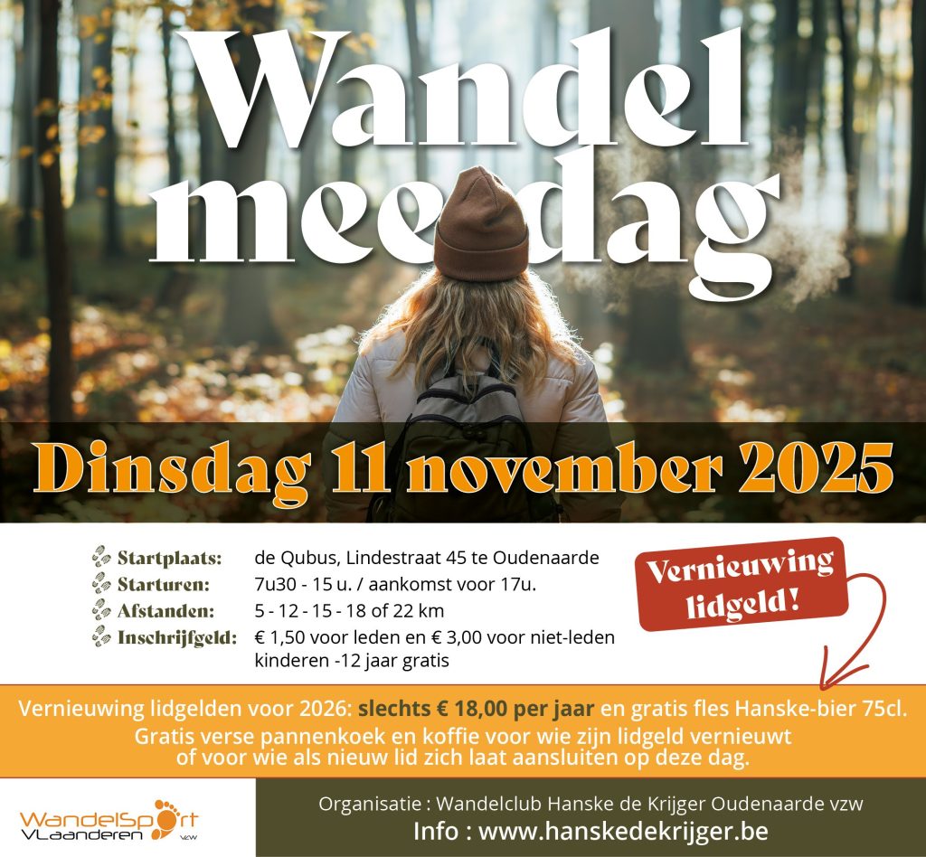 7 november 2025op dinsdag 11 november 2025 Afstanden :   5-12-15-18-22 km Starturen :   7u30 – 15u / aankomst…