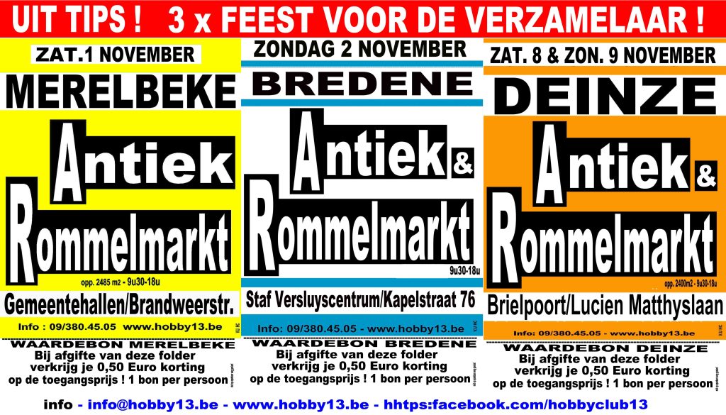 31 oktober 2025Zaterdag 8 & zondag 9 november 2025 - 09:30 tot 18:00 Antiek & Rommelmarkt DEINZE (9800) Brielpoort/Lucien Matthyslaan 9 Ontdek…