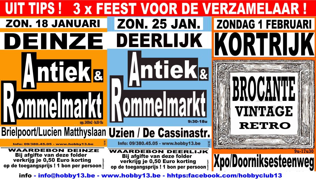 18 januari 2026Zondag 1 februari 2026 KORTRIJK (8500) Xpo hall 3/Doorniksesteenweg 216 Retro-Brocante-Vintage Van 09:30 tot 18:00 Ontdek meer data via www.hobby13.be