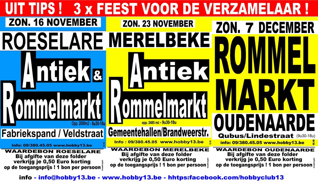 13 november 2025Antiek & Rommelmarkt Zondag 7 december 2025 - 09:30 tot 18:00 OUDENAARDE (9700) De Qubus/Lindenstraat 47 Ontdek meer data via www.hobby13.be