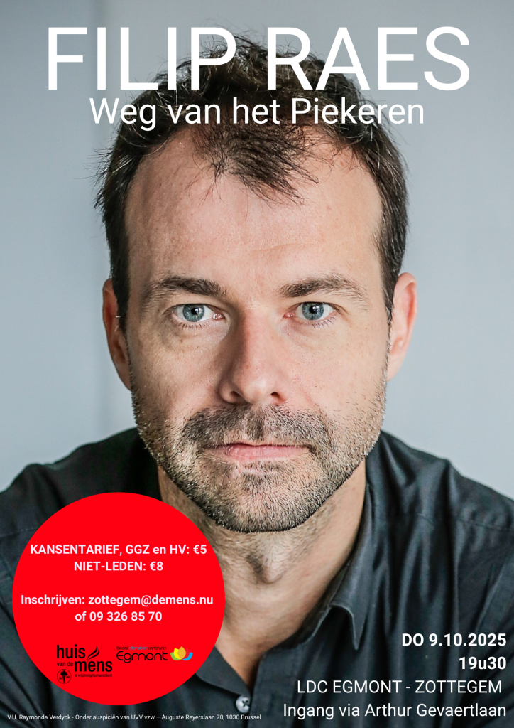 9 september 2025WEG VAN HET PIEKEREN Lezing door professor & gedragstherapeut Filip Raes. Do 9 oktober 2025 - 19u30 LDC Egmont, Deinsbekestraat…