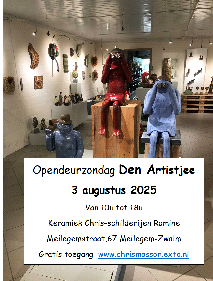 28 juli 2025Opendeurzondag Den Artistjee 3 augustus 2025 Van 10u tot 18u Keramiek Chris-schilderijen Romine Meilegemstraat,67 Meilegem-Zwalm Gratis toegang www.chrismasson.exto.nl
