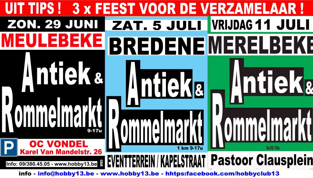 28 juni 2025Vrijdag 11 juli 2025 MERELBEKE (9820) van 09:30 tot 18:00 Antiek & Rommelmarkt Pastoor Clausplein, Flora Plein, Koning Boudewijnstraat  www.hobby13.be