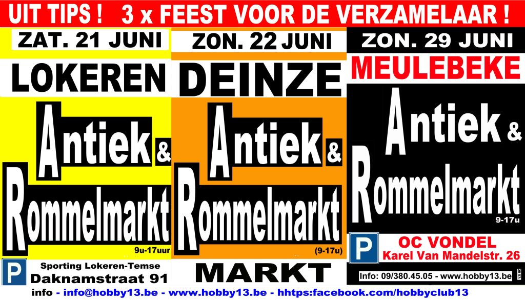 20 juni 2025Zondag 29 juni 2025 van 09 tot 17 u MEULEBEKE (8760) Antiek & Rommelmarkt parking OC De Vondel Karel Van…