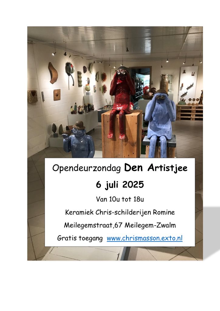 12 juni 2025Den Artistjee zondag 6 juli 2025 van 10u tot 18u Meilegemstraat,67 in Meilegem-Zwalm keramiek van Chris Masson en schilderijen van…