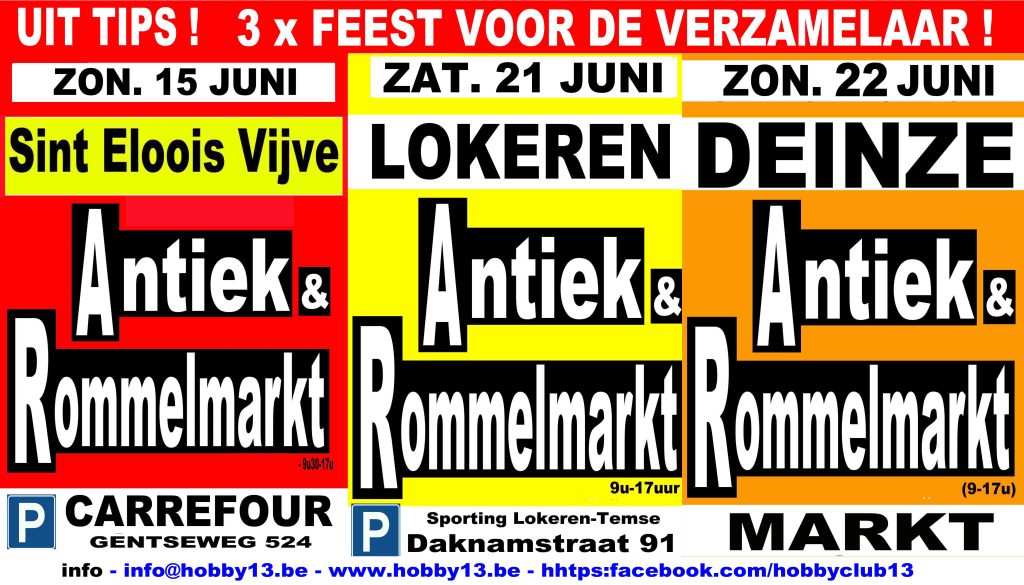12 juni 2025Zaterdag 21 juni 2025 LOKEREN (9160) Antiek & Rommelmarkt van 09 tot 17 u parking voetbalclub Lokeren-Temse Daknamstraat 91 Â www.hobby13.be