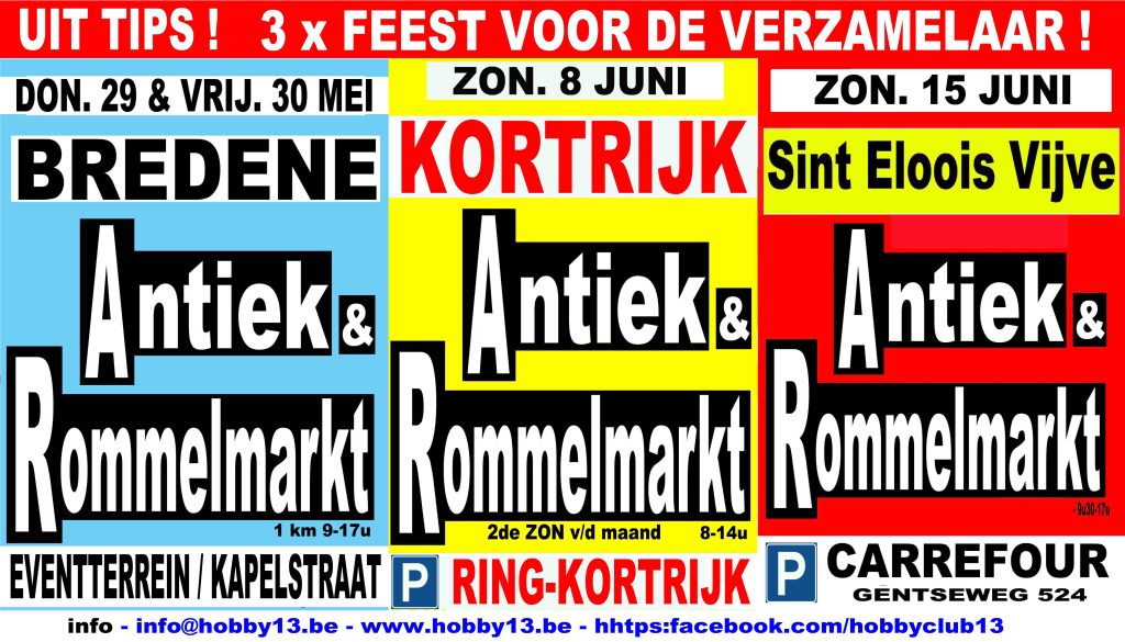 28 mei 2025Antiek & Rommelmarkt Zondag 15 juni 2025 - van 9u30 tot 17uur SINT ELOOIS VIJVE (8793) parking GB Carrefour Gentseweg…