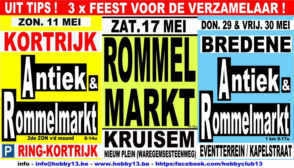29 april 2025ZON. 11/05/25 KORTRIJK Ring/parking Ringshopping (Antiek & Rommelmarkt) buiten ZAT. 17/05/25 KRUISEM Nieuwplein/Blekerijstraat/Woestijnestraat (Antiek & Rommelmarkt) buiten DO 29/05/25 en…