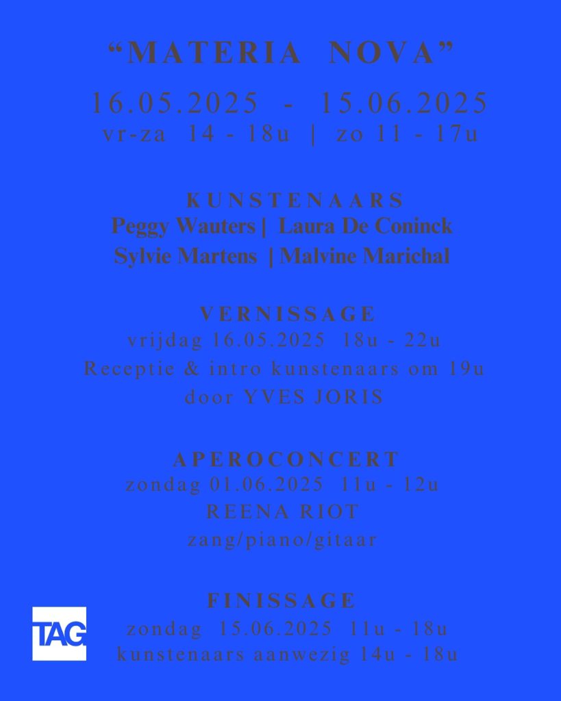 27 april 2025EXPO MATERIA NOVA 16/05/2025 – 15/06/2025 Friday – Saturday 14:00–18:00 Sunday 11:00–17:00 Artists Peggy Wauters - Laura de Coninck - Sylvie Martens - Malvine…