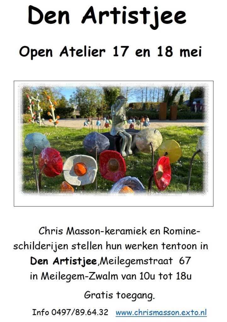 26 april 2025Den Artistjee Open Atelier 17 en 18 mei Chris Masson-keramiek en Romine-schilderijen stellen hun werken tentoon in Den Artistjee,Meilegemstraat 67…