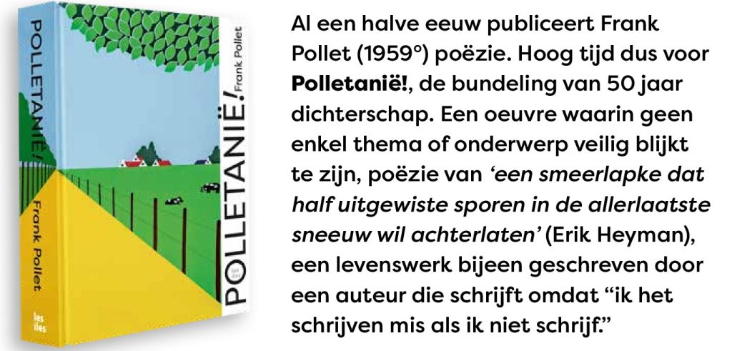 26 maart 2025Een overzicht van het strafste poëtisch werk van Frank Pollet. Wees welkom in Polletanië! Al een halve eeuw publiceert Frank…