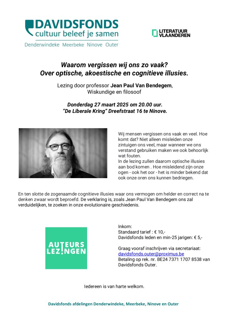 10 maart 2025Waarom vergissen wij ons zo vaak? Over optische, akoestische en cognitieve illusies. Donderdag 27 maart 2025 om 20.00 uur. “De…