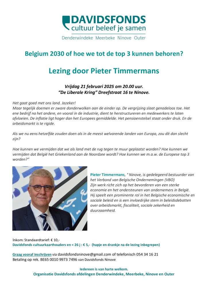 6 februari 2025Belgium 2030 of hoe we tot de top 3 kunnen behoren? Lezing door Pieter Timmermans Vrijdag 21 februari 2025 om…