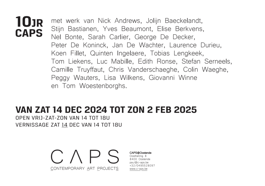 5 december 2024CODA 14 dec - 02 feb 2025 Contemporary Art Projects Oosthelling 8 -Â 8400 Oostende open vrij-zat-zon van 14:00 tot 18:00…