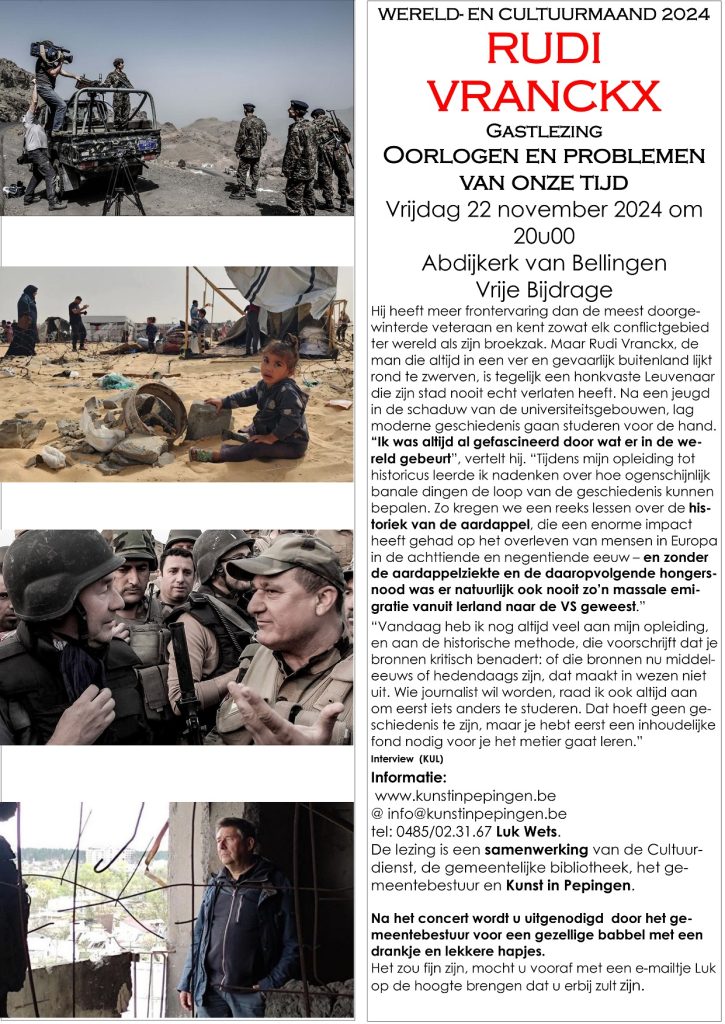 2 november 2024Oorlogen en problemen van onze tijd Vrijdag 22 november 2024 om 20u00 Abdijkerk van Bellingen Vrije Bijdrage "Oorlogsjournalistiek is een…