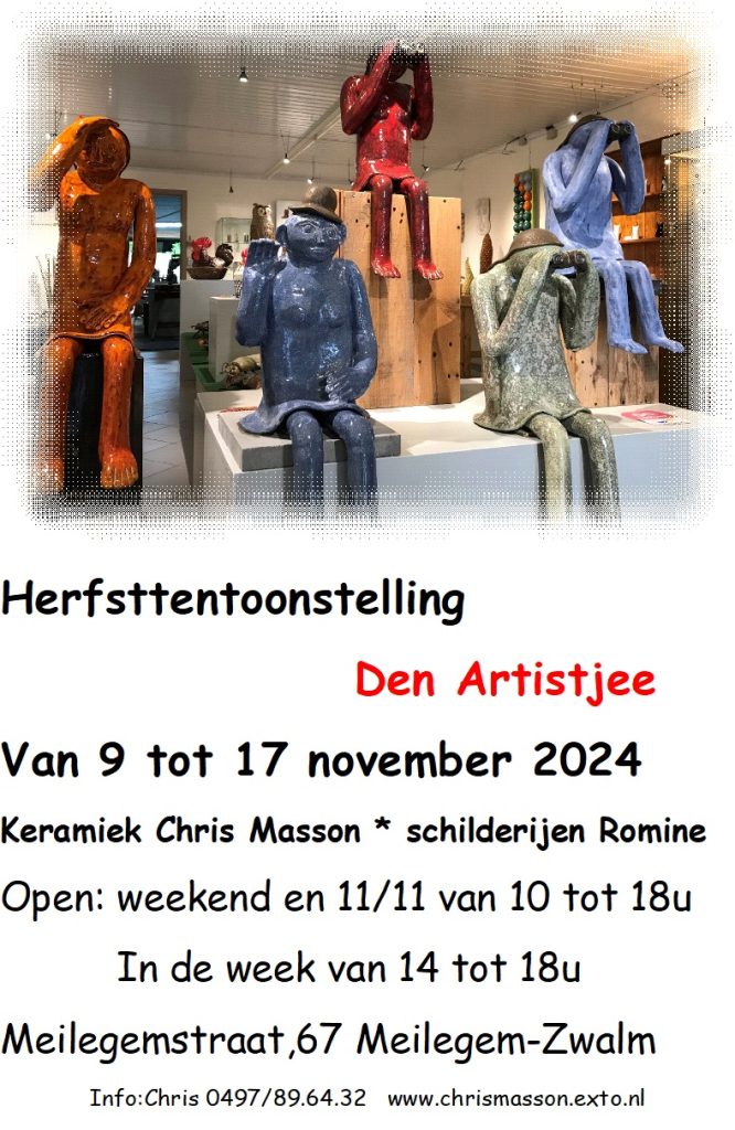 22 oktober 2024Herfsttentoonstelling Den Artistjee van 9 tot 17 november 2024Â open tijdens het weekend en op 11/11 van 10u tot 18u…