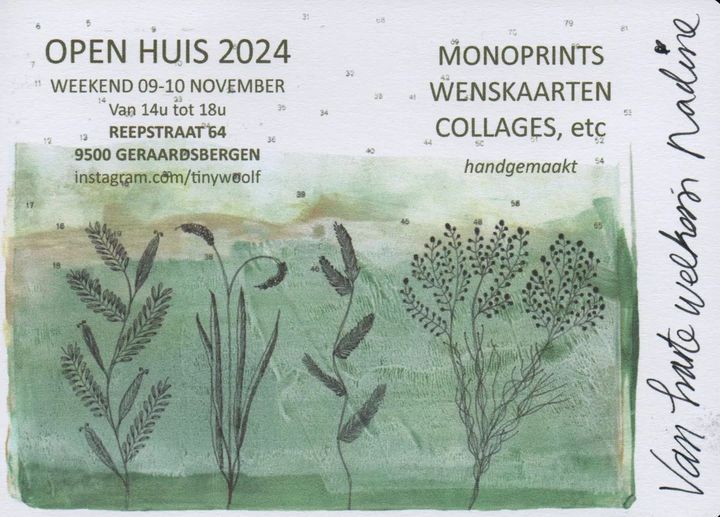 22 oktober 2024Weekend 09 en 10 november 2024 van 14 tot 18 uur Reepstraat 64 Geraardsbergen Nadine Paduart stelt tentoon Monoprints, wenskaarten,…