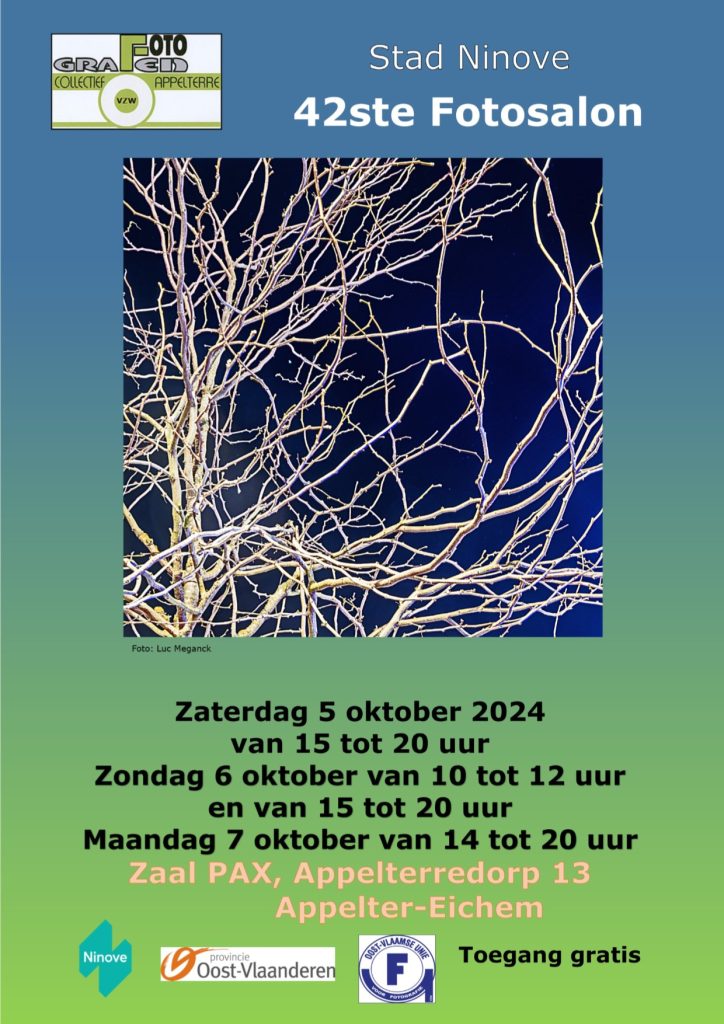6 september 2024Tentoonstelling : 42ste Fotosalon zaterdag 5 oktober tot maandag 7 oktober 2024 zaal Pax Appelterredrop 13 Appelterre-Eichem zaterdag : 15:00…