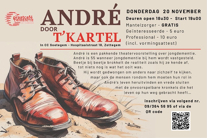 7 november 2025theatervoorstelling “André" Op donderdag 20 november organiseren we in samenwerking met CC Zoetegem de pakkende theatervoorstelling “André”, een aangrijpend verhaal over jongdementie. Deuren openen…