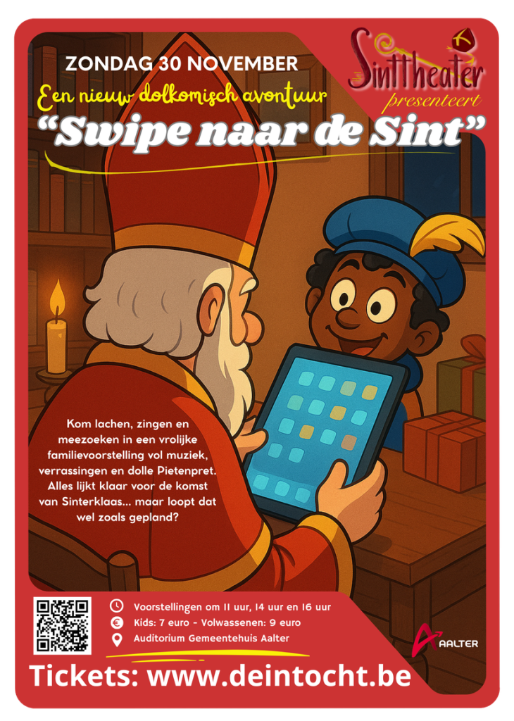 6 oktober 2025“Swipe naar de Sint” Zondag 30 november 2025 van 11:00 tot 17:00 voorstellingen om 11 uur, 14 uur en 16 uur. Auditorium Gemeentehuis…