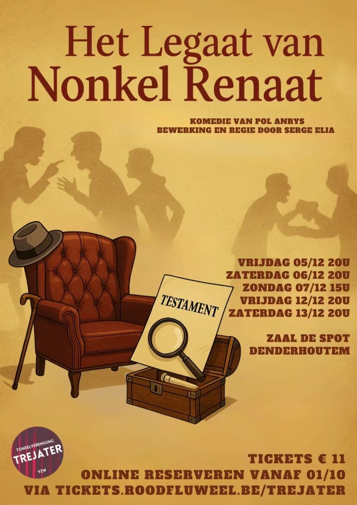 20 november 2025Het legaat van nonkel Renaat vr 5 december 2025van 20:00 tot 22:30 za 6 december 2025van 20:00 tot 22:30 zo 7 december 2025van 15:00 tot 17:30 vr 12 december 2025van 20:00 tot 22:30 zo 14 december 2025van 15:00 tot 17:30…