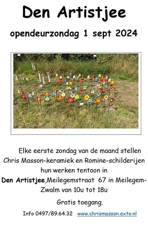 opendeurzondag 1 sept 2024 Elke eerste zondag van de maand stellen Chris Masson-keramiek en Romine-schilderijen hun