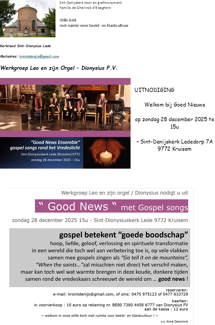 Gospel  concert zondag 28 december 2025 – om 15:00 Sint-Dionysiuskerk Lededorp 7a Lede (Kruisem) inkom