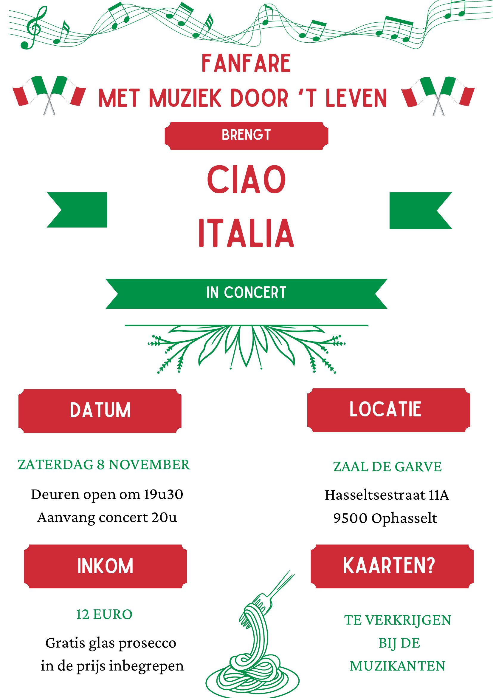 CIAO ITALIA Jaarlijks concert van fanfare “Met Muziek door ’t Leven” uit Ophasselt. zaterdag 8